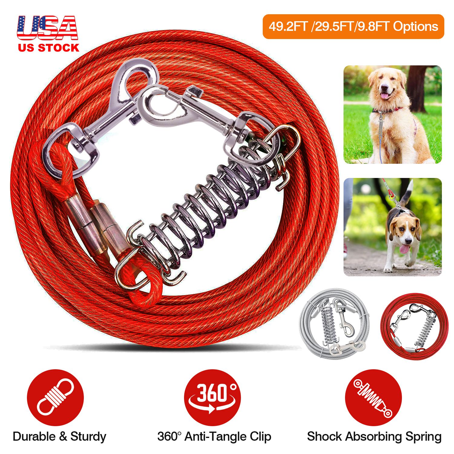 Home > 49.2FT Dog Tie Out Cable Long Dog Leash Chew Proof Lead Dog Chain with Durable Spring 360° Rotatable Clips PVC Case for Outside Yard Caming